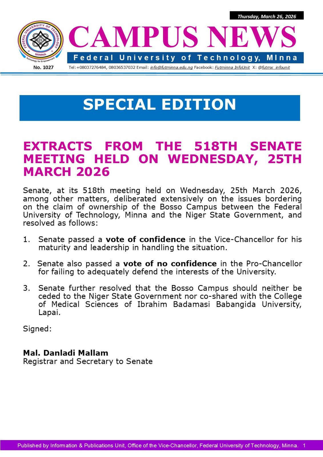 Federal University of Technology Minna > Blog > EXTRACTS FROM THE 518TH SENATE MEETING HELD ON WEDNESDAY, 25TH MARCH 2026